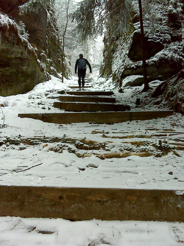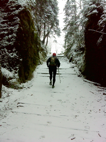 | Gut, eine weitere sportliche Maßnahme geplant zu haben! Wiese und ich (Volker) machten uns auf eine Trailrunning-Runde durch den Nationalpark Sächsische Schweiz. Zum einen als Training für die in diesem Jahr noch anstehenden Events gedacht und weiterhin ein Testlauf mit ungewohntem, für eben diese Events vorgeschriebenem Equipment, wie Stöcke und Trink-Rucksack etc.. Um es vorwegzunehmen, es war ein Heidenspaß, der förmlich nach Wiederholung schreit! Wiese hatte eine herrliche Runde ausgesucht, mit Start und Ziel an der Gaststätte & Pension am Weinberg in Mittelndorf. Zum Warmwerden ging es zunächst einmal ins Kirnitzschtal hinab, bevor der Anstieg in Richtung Hohe Liebe, am Falkenstein vorbei, weiter zu den Schrammsteinen schon etwas mehr Einsatz erforderte. Der Elbleitenweg führte uns danach, am Fuß des Teufelsturms vorbei, genüsslich in Richtung Schmilka, bis der an der Zwieselhütte beginnende Anstieg, auf dem Wurzelweg zum Großen Winterberg, uns wieder ordentlich zu schaffen machte. Erholung war später im Abstieg auch nicht gegeben, Schnee und Eis in den Richterschlüchten setzten uns ordentlich zu und das Mitführen von Stöcken machte sich hier wirklich bezahlt. Ab dem Zeughaus, auf der Zeughausstraße durch den Wildensteiner Wald, war der anstrengendste Teil unserer Tour geschafft. Die Anstiege waren nun gemäßigt und über einige eisglatte Passagen hinweg erreichten wir, durch den Dietrichsgrund, wieder die Kirnitzsch. Nun eine längere Strecke Asphalt und ab dem Forsthaus, noch einmal ordentlich und sehr anstrengend aufwärts, winkte uns nach 25,5 km schon das Ziel. | |||