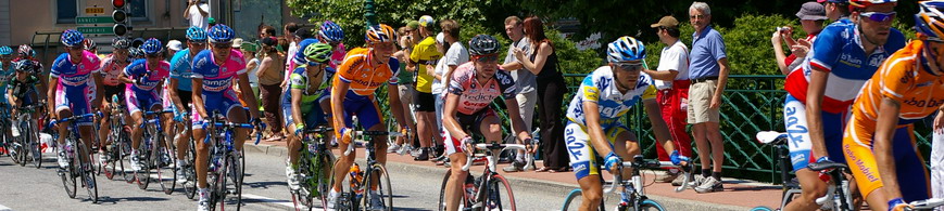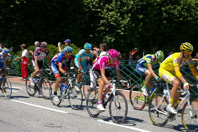 wir nicht missen wollen. Im Folgenden einige Bilder der letztjährigen 15. Etappe von Le Grand-Bornand nach Tignes. 165 km, gespickt mit allein drei Bergwertungen der ersten Kategorie und dazu noch eine Bergankunft auf 2.088 m. Der Mann in Gelb war übrigens Linus Gerdemann, der das Trikot dann an den Etappensieger Michael Rasmussen abgeben musste... Wir hatten uns als Standort dieses Mal kein bergiges Terrain ausgesucht, sondern lauerten in der pittoresken Olympiastadt Albertville auf das Geschehen, nach ca. 60 absolvierten Kilometern des Rennens. |